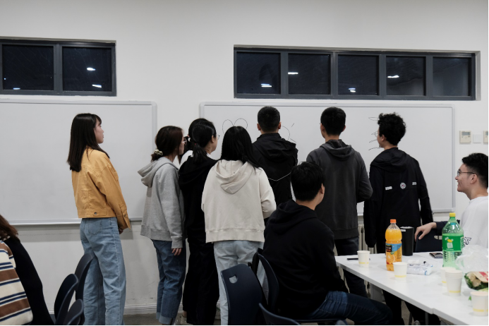 紧接着进入游戏环节。同学们贴上名牌,分为四组,进行“画一笔”挑战。各组依次派出相同人数,每个人均画一笔,共同描绘本组抽到的词条。各组其余的同学一起抢答自己的理解的描绘内容,答案与词条相同则一轮游戏结束。在多轮游戏中,同学们渐渐熟络起来,距离慢慢拉近。