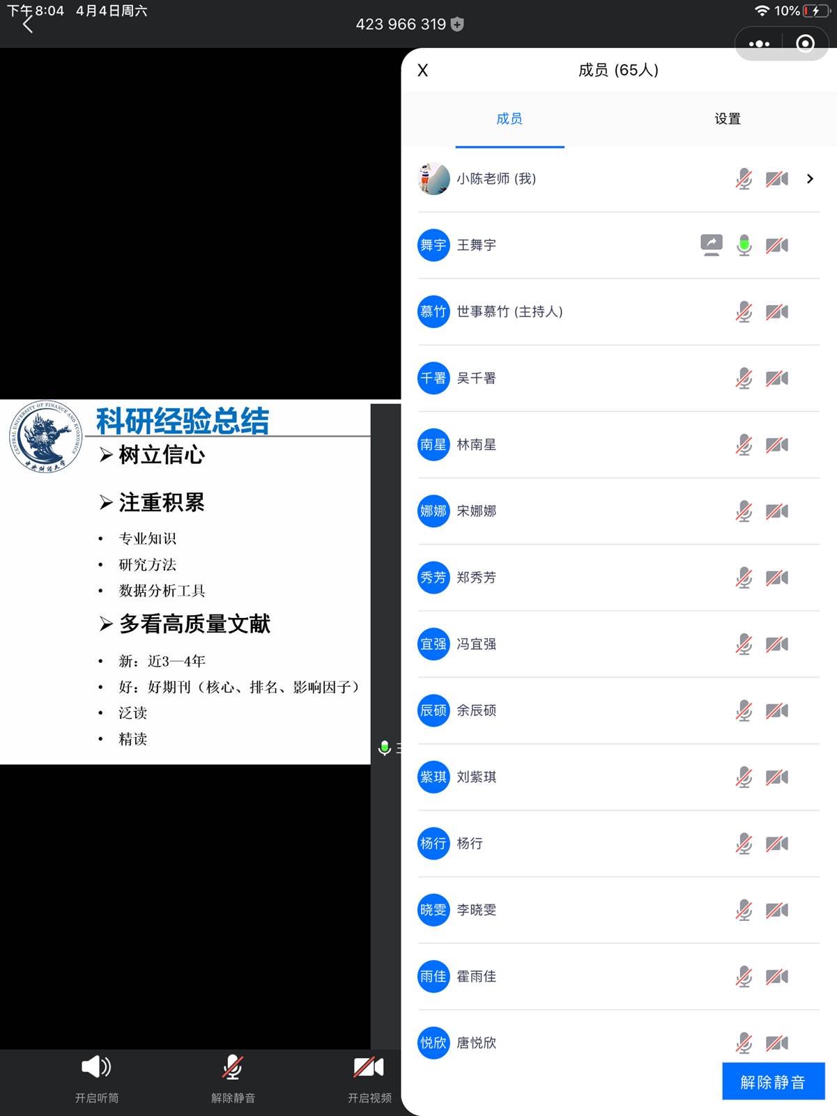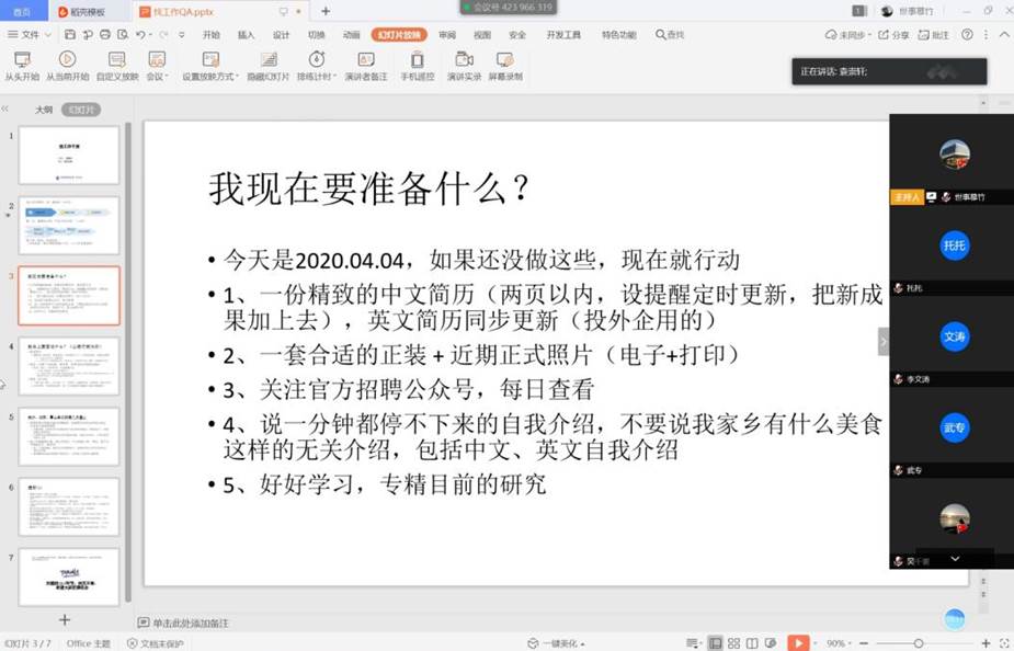 为督促2019级研究生在家更好地开展科研工作,有针对性地进行帮扶,公司研工办在班级内进行摸底,收集同学们近期在科研上遇到的问题,并于2020年4月4日晚8时,邀请了BETVICTOR2019年博士研究生国家奖学金获得者、国家公派联合培养博士生王舞宇开展线上科研分享活动,BETVICTOR研究生工作办公室主任陈玉婵老师、研究生辅导员陈文秀老师、BETVICTOR全体2019级研究生和部分本科生参加活动。
