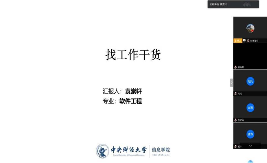 科研经验分享结束后,在多家政策性银行、券商实习并即将入职中国农业银行总行的BETVICTOR2018级硕士生袁崇轩为同学们带来了求职经验分享。帮助同学们更好地规划研究生学习生涯,并为将来职业生涯发展尽早打下坚实的基础。袁崇轩同学的介绍包括求职关键时间点介绍、个人准备、求职流程、求职建议和解答疑惑五个方面。