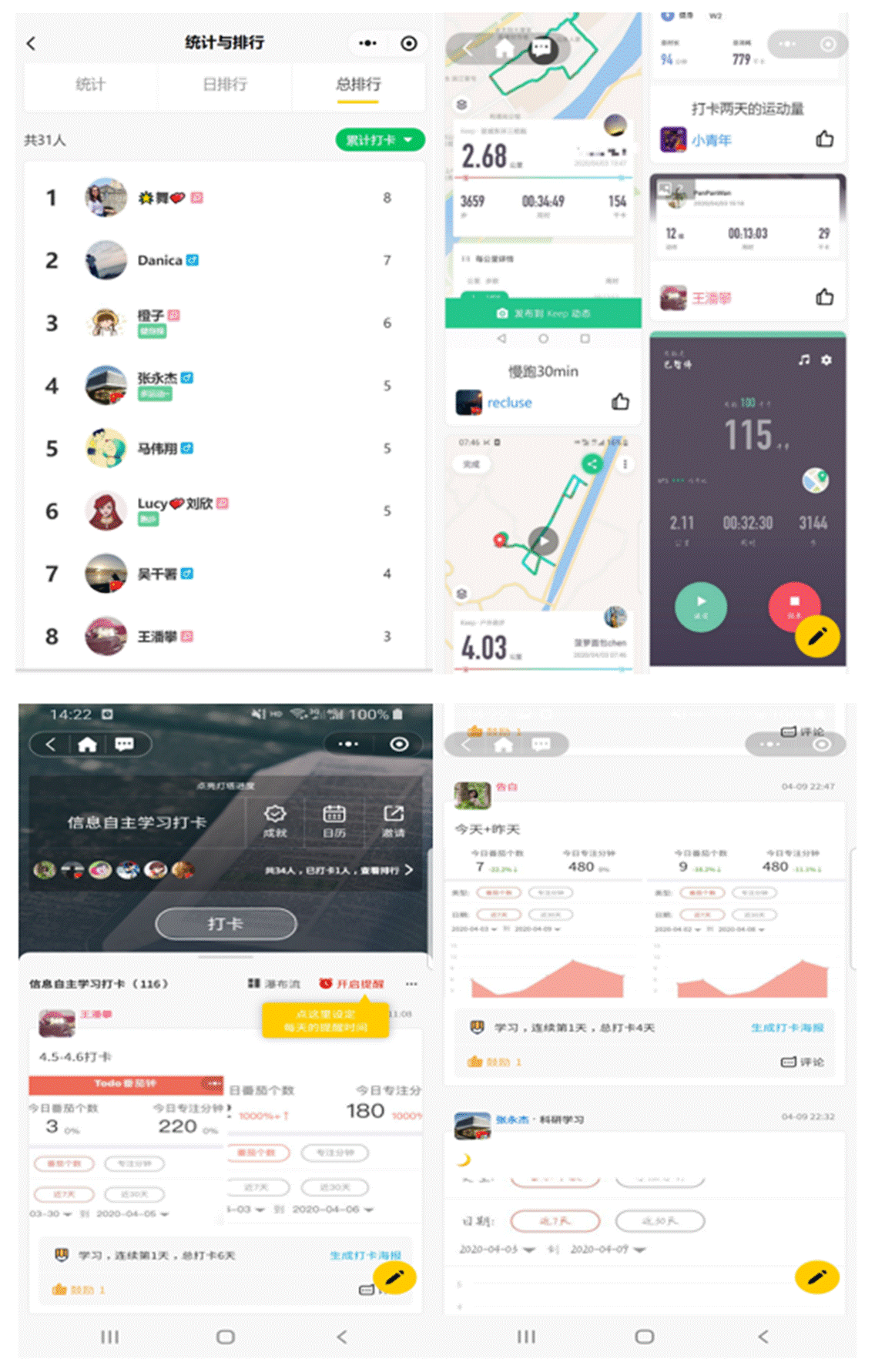 本次科研和运动打卡活动得到了同学们的积极响应,同学们纷纷表示在小组动态中看到其他同学的打卡,可以有效的督促自己行动起来,增强了紧迫感。并使大家互相鼓励互相促进,在班内形成了比、学、赶、帮、超的良好学风氛围。