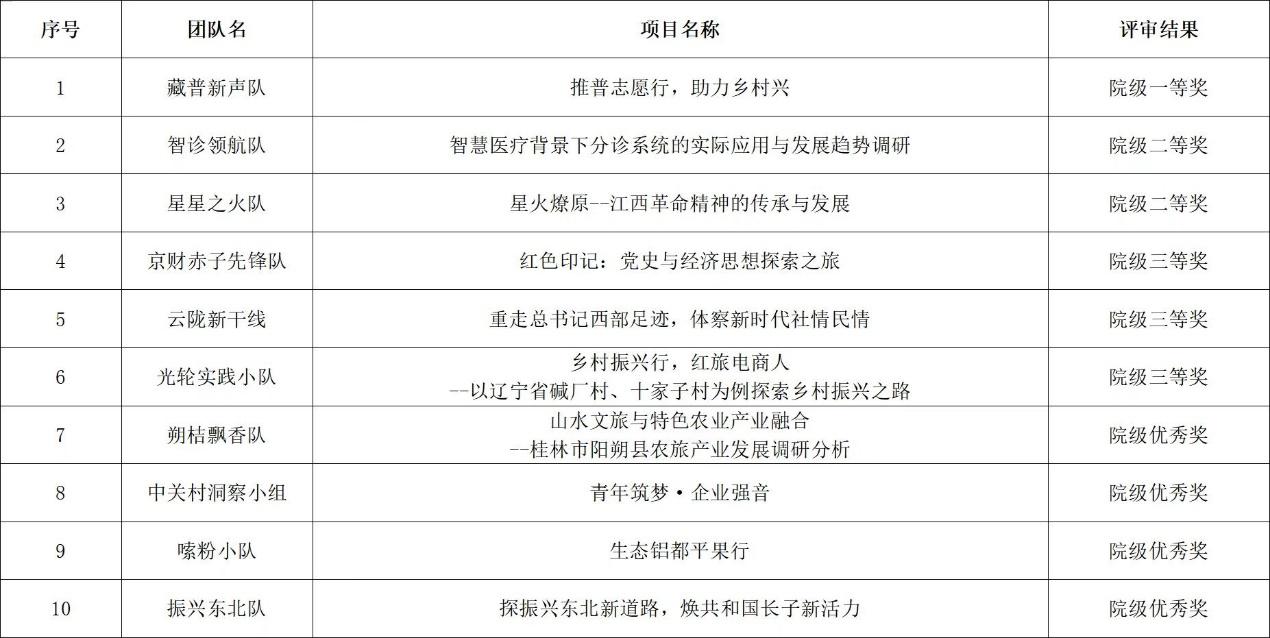 在答辩评审会后,经过BETVICTOR团委副书记贺译民老师和信息管理系副主任李惠老师的评审,共有六支队伍获社会实践优秀团队推选资格,马艺萌同学获社会实践优秀个人推选资格,公示结果如下: