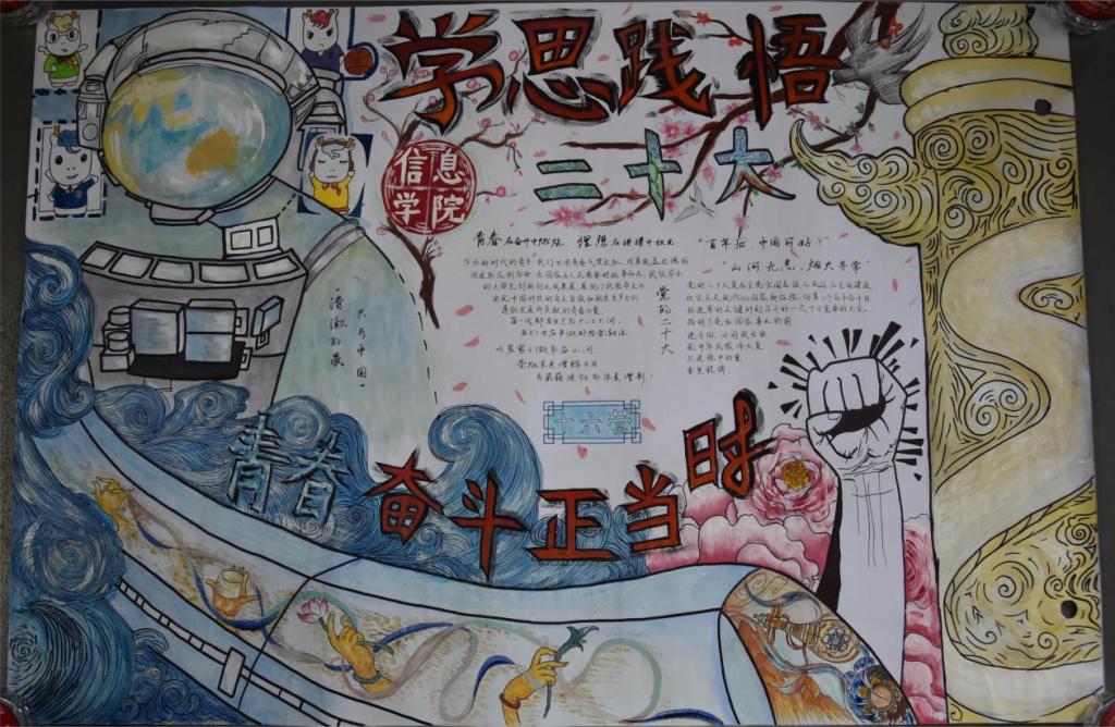 我们学习贯彻习近平新时代中国特色社会主义思想,不忘初心,牢记使命,善作善成,一往无前。经过十六营黑板报策划小组同学的勇敢尝试与创新,为我们大家展现了一幅优秀多彩的青春画卷。