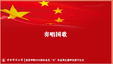 在暖心亲切的相互致意后,主持人方德风副书记宣布2020届毕业生“云”毕业典礼正式开始,典礼在庄严的国歌声中拉开帷幕。