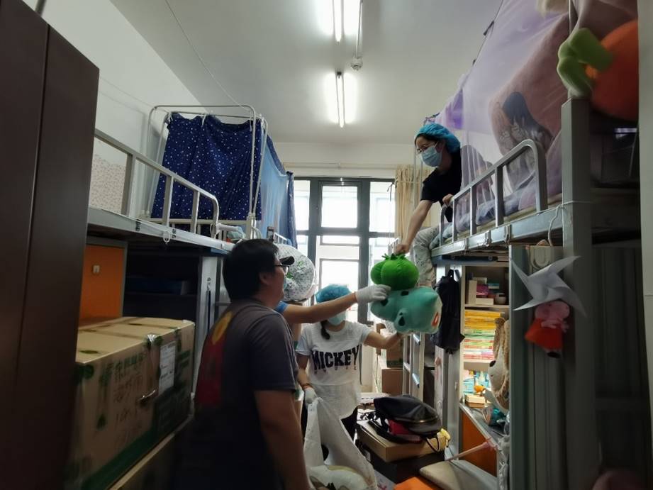 老师们在房间内分类整合、密封箱子。从上铺到桌底,从书桌到窗台,大到铺盖、脸盆,小到充电器,挂饰,无论物品大小,宿舍边边角角的每一件物品老师们都耐心询问,细心处理。