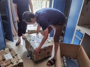 马燕林老师认真沟通装箱物品 王悦老师仔细询问索要书籍 祝世伟老师封箱