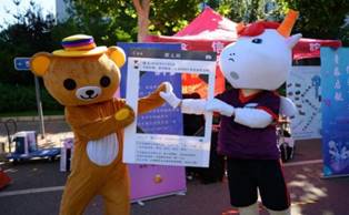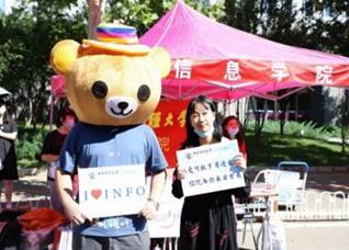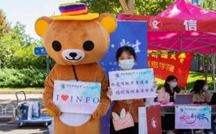 本科生报到日,财宝和信息熊击掌庆祝,公司门口竖起了大红标语牌欢迎新同学