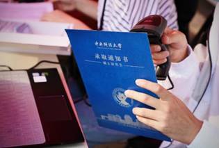 志愿者扫码录入报到信息,左为本科生录取通知书,右为研究生录取通知书