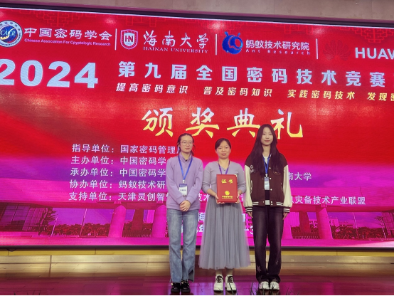 2024年11月28-30日,第九届全国密码技术竞赛决赛和颁奖典礼在海南大学成功举办。BETVICTOR段美姣老师指导的参赛团队,由2022级信息安全专业员工徐嘉璐、杨雨霏、吕睿组成,历经初赛、复赛和决赛的激烈角逐,最终凭借参赛作品“商用密码SMS4算法的安全性分析”荣获全国三等奖。